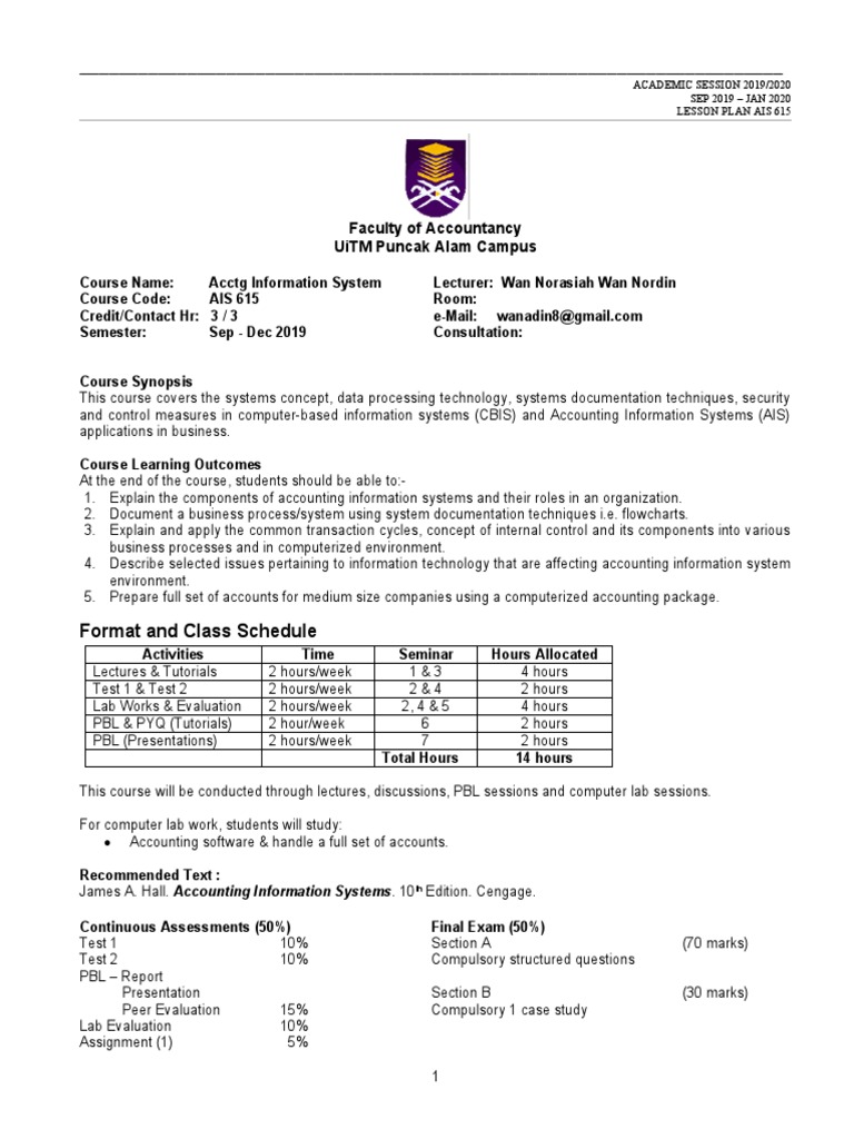 2019 09 Ais615 Lesson Plan Sep Dec 2019 Enterprise Resource Planning Information System